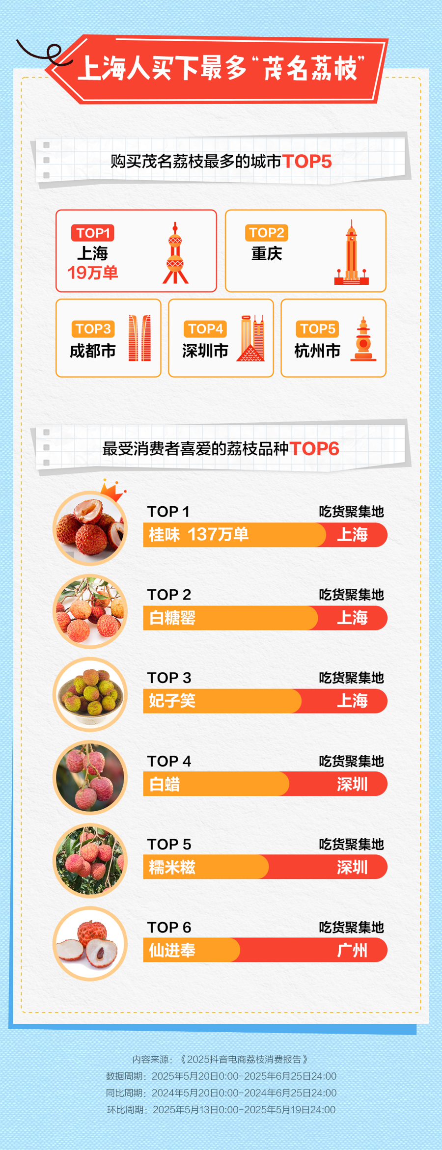 6月30日,抖音电商发布2025荔枝消费报告,呈现今年夏天平台荔枝销售情况、用户口味偏好等趋势。数据显示,5月20日至6月25日,平台广东荔枝订单量同比增长1509%,单品规模与增速均居行业前列。其中,茂名荔枝占比近7成。